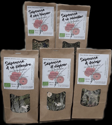Trois menthes – Bergamote, verte et poivrée Sapousse à se détendre – aubépine, cassis, verveine, camomille romaine Tilleul-menthe Sapousse à digérer – Menthe mélisse camomille Sapousse à se réveiller – Menthe,Thym citon, souci Sapousse à pas tousser – Hysope Thym Sureau Sapousse à dormir – Tilleul mélisse coquelicot