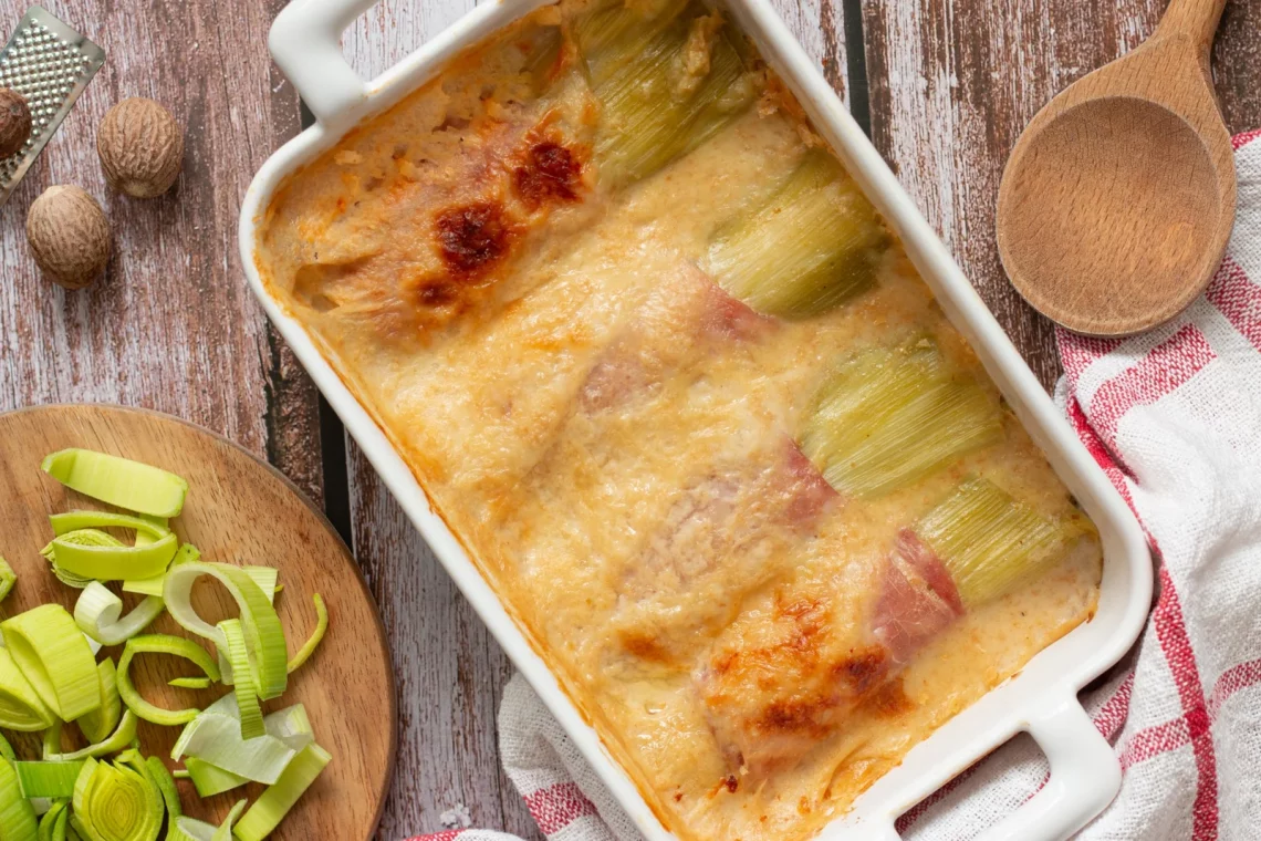 - Rouler les blancs de poireaux dans une tranche de jambon et les placer dans un plat à gratin, puis verser la béchamel par-dessus. Saupoudrer de fromage râpé ou de levure maltée.